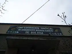 The Syndicalist Confederation of Intercultural Communities of Bolivia (Spanish: Confederación Sindical de Comunidades Interculturales de Bolivia; CSCIB) is a peasant union of rural communities in the lowlands of Bolivia whose members included people of highland origin. It is led by Pedro Calderón and includes federations in six departments: La Paz, Cochabamba, Santa Cruz, Tarija, Chuquisaca, and Beni. It was founded on February 18, 1971 as the Syndicalist Confederation of Colonizers of Bolivia (Spanish: Confederación Sindical de Colonizadores de Bolivia).[1] At the time, its independence from the government represented a defiant break from the so-called Military-Peasant Pact.