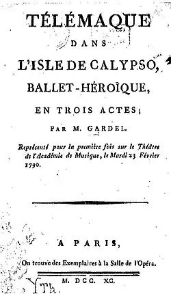 On 23 February 1790, Télémaque dans l'île de Calypso was premiered at the Opéra de Paris. It was performed until 1816, reinstated in 1819,[2] and remained in the repertoire until 24 November 1866.[3] Gardel's ability to combine character-driven pantomime with dance and the ballet's execution received contemporary praise.[4]