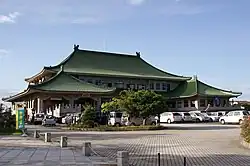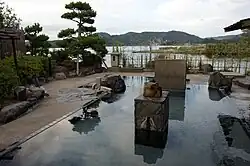 Use of the hot springs for bathing began in 1868, at the start of the Meiji Period; in 1872, a large bath tub was constructed on Ryūyu-tō Island, which was located on the lake.[5][8] A wealthy local farmer created a well for drawing spring water on the western bank of Tōgō River, as well as a separate building called the Yōshōkan, and gave access to the villagers. In 1884, this building began operating as a ryokan business.[5][9] With the opening of the San'in Main Line and Matsuzaki station at the end of the Meiji Period, the number of yearly visitors reached 10,000 and the name Tōgō Onsen was given to the area.[9][10] Japanese novelist Naoya Shiga once visited the Yōshōkan, and he mentions it in his short story collection Tottori.[11] The Yōshōkan is still operating today.