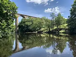 The country park lies on the banks of the River Dee and its SSSI, within the Vale of Llangollen in the Dee Valley.[2][3][4] It is situated next to and underneath the stone-built Cefn Viaduct carrying the Shrewsbury to Chester railway line.[2][3][4] It is situated 5 miles (8.0 km) south of Wrexham.[5] The park is downstream from Pontcysyllte Aqueduct has been within the boundaries of the buffer zone of the aqueduct's World Heritage Site since 2009,[6] and within the Clwydian Range and Dee Valley Area of Outstanding Natural Beauty since 2011.[2]