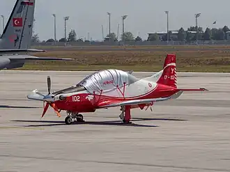 The TAI Hürkuş (Free Bird)[4] is a tandem two-seat, low-wing, single-engine, turboprop aircraft being produced by Turkish Aerospace Industries (TAI) as a trainer and ground attack aircraft for the Turkish Armed Forces.[5][6][7]