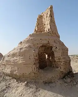 At the center of the site lies the foundation of a large temple building, north of which is the main pagoda standing 14.5 metres (48 ft) tall. The adobe structure is covered by white lime and is of the shape of an overturned bowl. North of the main pagoda are the remains of 11 smaller ones.[1][2] Most of the extant ruins date from the Western Xia dynasty, including all of the pagodas.[1][2]