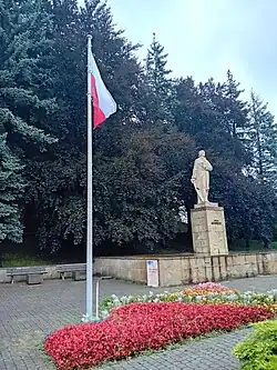 The first Tadeusz Kościuszko monument in Sanok existed from 1902 to 1941 and was located at St. John's Square. The second monument was erected as part of the celebrations marking the 800th anniversary of Sanok[1] and the 1000th anniversary of Polish statehood.[2] Although Sanok's first mention dates to 1150, the city's jubilee was delayed from 1950 and held in 1962, coinciding with the national milestone. In 1956, a Civic Committee for the Reconstruction of the Tadeusz Kościuszko Monument was formed, chaired by Tadeusz Walciszewski[1] and including members such as Jan Bezucha, Stefan Stefański, and Mieczysław Przystasz.[3] Initially, the committee planned to rebuild the monument at its original location in St. John Square, supported by individuals including Jadwiga Zaleska, Tomasz Tomasik, Emilia and Edmund Słuszkiewicz, and Jan Świerzowicz.[4] However, this plan was not realized. On 25 April 1957, Jadwiga Zaleska appealed to the Sanok National Council to reconstruct the monument at St. John Square.[5] In 1960, plans for the monument were announced in connection with the 550th anniversary of the Battle of Grunwald in 1410.[6]