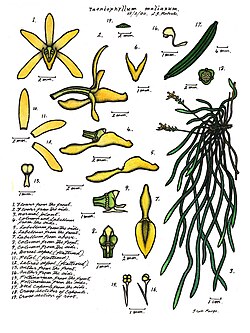 Taeniophyllum malianum, commonly known as the tangled ribbonroot,[2] is a species of leafless epiphytic or lithophytic orchid that forms tangled clumps. It has flattened green roots with irregular white spots and pressed against the substrate on which it is growing. There are up to fifteen fragrant yellow, short-lived flowers with up to three open at the same time. It only occurs in tropical North Queensland and in New Guinea.