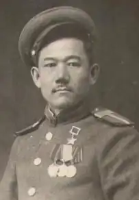 Taimbet Komekbaev (Kazakh: Тәйімбет Көмекбаев; 1896 – 13 February 1987) was a Kazakh starshina in World War II. He was awarded the title Hero of the Soviet Union and the Order of Lenin for his actions in the Sandomierz–Silesian Offensive.