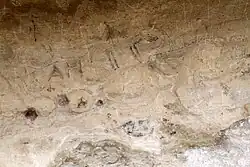 The Takiroa Historic Area features several Māori drawings made from ochre, bird fat, and charcoal.[2][3] The subject matter present in the shelter is variable. Some drawings have been interpreted as people and animals, such as birds.[4] Depictions of European settlers are also apparent, which feature the likes of horses and ships.[4]