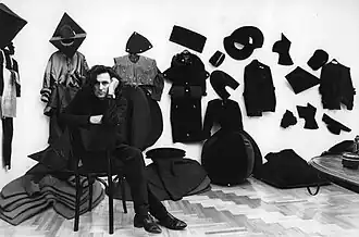 Király lacked the credentials to be officially registered as an artist, complicating his career.[6][18] For one of his fashion shows, he used a rejection letter from the Hungarian Arts Fund as the poster.[6] Király was poor during the 1980s, scraping by through commissioned work and borrowing money from friends; however, he held many parties.[19] Friends described him as kind and sociable;[20] his surname, which translates to "king", resulted in his cult following, consolidated in or around 1986, being labeled as "royalism" (királyizmus).[21] His devotees greeted him with a related pun: Éljen a Király! ("Long live the King!").[22]