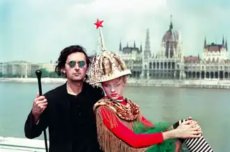 Király's career as an independent fashion designer coincided with Hungary's experiment in "Goulash Communism"—integrating free-market elements to the socialist command economy and loosening political censorship restrictions.[7] He initially sold his creations out of New Art Studio, an underground boutique in central Budapest, whose main founder was his mentor, Koppány.[5] Though "his store did not have a sales counter, and customers were received at extreme opening hours", it was a major success, with queues of customers meandering around the street-corner.[8] Király also flaunted convention by using live models in the display window.[1] Beginning in 1981, he organized "fashion walks" on Váci Street, an upscale fashion district in central Pest, in which his friends would dress up in outre outfits without permits,[9] including trash bags and bank notes.[10][1] His first fashion show was at the Fiatal Művészek Klubja (FMK; "Club for Young Artists") in 1983.[1] Király often showcased his works at the Petőfi Csarnok, a large community center with a concert hall.[9][11] The runway shows he held there, which he called "fashion performances," incorporated elements of contemporary dance and performance art.[12][9] He also collaborated with theater groups starting in the 1980s, most famously designing white- and cream-colored costumes evoking the phantasmagoric atmosphere of A Midsummer Night's Dream for a reinterpretation by the Baltazar Theatre, a company of intellectually disabled actors.[9]