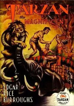 Tarzan the Magnificent is a book by American writer Edgar Rice Burroughs, the twenty-first in his series of twenty-four books about the title character Tarzan. It was originally published as two separate stories serialized in different pulp magazines; "Tarzan and the Magic Men" in Argosy from September to October, 1936, and "Tarzan and the Elephant Men" in Blue Book from November 1937 to January 1938. The two stories were combined under the title Tarzan the Magnificent in the first book edition, published in 1939 by Edgar Rice Burroughs, Inc.