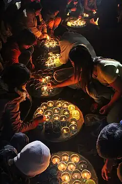 In ancient times, candles used during the festival were made of gooseberry wood and, people attempted to offer the candles as much as possible symbolising reverence for the Buddha, despite their inability to reach heaven, inspiring a sense of sacredness.[5] To overcome this, fire balloons are started to be used instead of candles, representing the homage to the Buddha.[3]