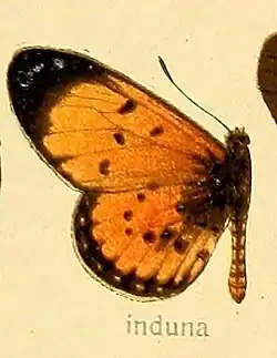 Acraea induna, the induna acraea, is a butterfly of the family Nymphalidae. It is found in Malawi, Zambia, Zimbabwe and South Africa. The habitat consists of woodland and montane grassland.[2]