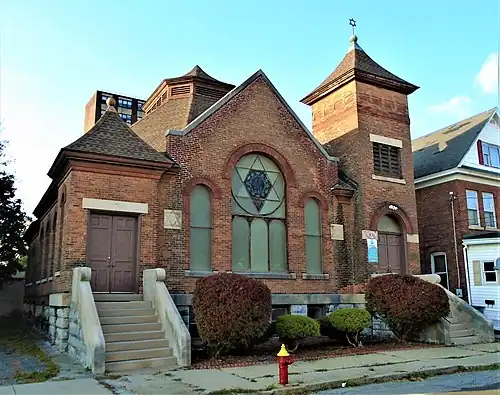 The former synagogue is a 1+1⁄2-story, rectangular, eclectic brick building which has an octagonal roof and is topped by an octagonal louvered cupola. It features two turreted towers of unequal height with pyramidal roofs and a rose window with Star of David over three round arch windows.[2][3]