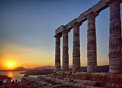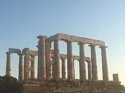 The Temple of Poseidon is an ancient Greek temple on Cape Sounion, Greece, dedicated to the god Poseidon. There is evidence of the establishment of sanctuaries on the cape from as early as the 11th century BC. Sounion's most prominent temples, the Temple of Athena and the Temple of Poseidon, are however not believed to have been built until about 700 BC, and their kouroi (freestanding Greek statues of young men) date from about one hundred years later.[1] The material and size of the offerings at the Temple of Poseidon indicate that it was likely frequented by members of the elite and the aristocratic class.[2]