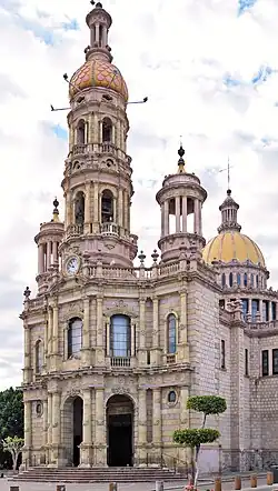 The Church of Saint Anthony of Padua (Spanish: Templo de San Antonio de Padua) is a Catholic church and monument in downtown Aguascalientes, Mexico, built between 1895 and 1908. The church is widely considered the masterpiece of Refugio Reyes Rivas, a mason who went to become one of the most influential architects in the region. In this work Rivas departed from any specific style, explicitly choosing an eclectic architecture drawing from neoclassical, baroque, Russian and even gothic and Islamic influences.[1][2] The building was originally commissioned by the franciscans, but it is currently managed by the Order of Saint Augustine.