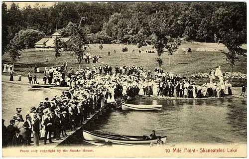 Ten Mile Point (Tenmile Point[1]) is a scenic area on the shore of Skaneateles Lake, New York, a popular picnic spot for lake outings in the late 19th and early 20th centuries.[2][3][4][5] It is located at the mouth of a ravine[6] on alluvium.[7] Onondaga County Road 72 runs through it and is locally known as "10 Mile Point Road".[8] It was formerly the property of the Skaneateles Railroad and Steamboat Company (Skaneateles Park Company) who built a steamboat dock, a dancing pavilion and planted a grove of trees there.[6][9] Their planned hotel[6] was never built.[10] And in 1906 Ten Mile Point was purchased by the Auburn and Syracuse Electric Railroad Company from the Skaneateles Park Company.[11] It is now the location of Lourdes Camp, an historic facility of the local Roman Catholic diocese. In 1990 the "Six Town Picnic'" that had been held annually from 1885 until World War II was revived at Ten Mile Point.[2]