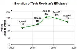 155. ^ "Tesla Motors". Archived from the original on October 26, 2008. Retrieved October 29, 2008. *[244 mile] Range is based on our most recent testing with a Validation Prototype car at a location certified by the U.S. Environmental Protection Agency (EPA) in August 2008. EPA-certified electricity consumption is 28 kWh per 100 miles (17 kWh/100 km) on EPA combined cycle. EPA range and electricity consumption are subject to change pending future testing. Actual range and electricity consumption will vary with driving conditions and charging location. [Pennies per mile] Cost calculated using average winter/summer PG&E schedule E-9 off-peak "rate A" tariff, as of March 1, 2007.