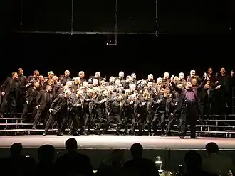 The July 2005 International Chorus contest in Salt Lake City was a new experiment. 12 wild card choruses competed against each other on Thursday of the convention week. From those 12, 6 were selected to compete in the international chorus finals on Saturday. The Texas Millionaires were among the only choruses competing who were on their first trip to International. They made the finals and the "scarecrows" competed on Saturday, finishing 17th.