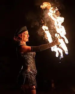 The festival grounds feature 25 stages, which host a wide variety of performances. The festival features several medieval-themed music and dance groups, including everything from belly dancing, to harps and fiddles, to bagpipes and accordions, to the carillon.[9] Throughout the festival park several demonstrating artists can be found presenting the methods of various medieval trades, such as glassblowing, forging armor, candle-making, coin minting, and others to visitors.[10]
