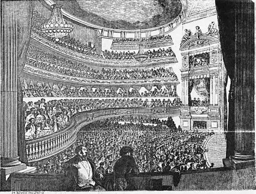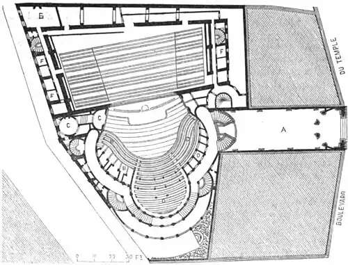 The theatre was designed to accommodate two divergent types of audience, that of the working class common to the boulevard du Temple and that of the most brilliant society of Paris, on whom the directors of the theatre depended as their patrons. "What was desired, therefore, was a building so arranged that the élite of Parisian society might find every provision for their comfort without in any way trenching upon that of the ordinary public of the theatres of the Boulevard."[8]