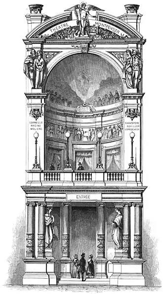 The awkward site, wedged between two buildings at the front, and wide at the back on the rue des Fossés du Temple, "required great skill in adapting it to its new purpose."[8] The facade on the boulevard du Temple was unusually tall and narrow, not more than 26 feet (7.9 m) in width. The entrance was flanked by two pairs of engaged fluted Ionic columns on a high base with two broad sculptured bands on the lower portion of each column. Two facing caryatides, presenting in profile to the boulevard and representing the muses of Tragedy and Comedy, supported the flat architrave at the front of a semicircular entryway with four equally spaced Ionic columns delimiting the curvature of the inside doorway.[9]