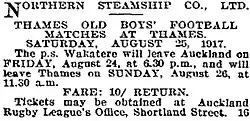 On 25 July, the Auckland Rugby League gave permission at their committee meeting for Thames and Ponsonby United to visit Thames.[35] They left Auckland on Friday 24 August at 6.30pm on board the Wakatere, returning on Sunday 26 August at 11:30am, with tickets for the excursion costing 10 shillings.[36] The teams to travel were both Thames Old Boys sides, with their opponents being the Ponsonby second-grade side, and the Grafton fourth-grade side. Once more, the matches were to be held at Dodd's Paddock in Parawai, which the Thames Hockey Association had given permission to be used. The money raised the previous year and this year was presented to the Thames Women's Patriotic League for the "Christmas billy fund".[37] The two second-grade sides had finished champions (Ponsonby) and runners-up (Thames Old Boys) with the match admission being sixpence.[38]