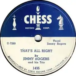 On August 15, 1950, Jimmy Rogers recorded "That's All Right" at the end of recording session for Muddy Waters.[3] Little Walter on harmonica and Ernest "Big" Crawford on bass also participated, but Muddy Waters does not appear.[3] The trio performed the song as a moderate- to slow-tempo twelve-bar blues. It features Rogers' guitar and plaintive vocals, with Little Walter playing in the style of Sonny Boy Williamson I.[5]