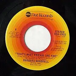 "That's What Friends Are For" was released as a single on ABC/Dot Records on April 12, 1976. It was backed on the B-side by the song "The Beginning of the End". The track was issued by the label as a seven inch vinyl single.[4] The single spent 13 weeks on America's Billboard country songs chart, peaking at number 16 by August 1976. It was Mandrell's second single issued by the label.[5] In Canada, the single climbed to the number 27 position on the RPM country chart.[6] The song was released on Mandrell's first album for the label, which was titled This Is Barbara Mandrell. The album was released in 1976.[7]