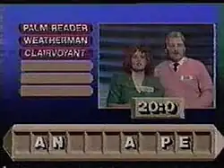 In order to fill-in the blank spaces in the puzzle, a series of toss-up clues were played. The clues were usually one word in length, but certain clues called for two or even three words to be used. The contestants were told how many letters were in the clue and the letters were put into the clue one at a time until one of the contestants buzzed in. If that contestant gave a correct answer, the couple scored $25. If not, the clue would be filled in up to the last letter and the opposing contestant got the chance to guess.