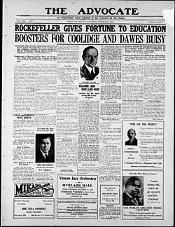 The Advocate was a four-page weekly newspaper in Portland, Oregon,[1][2] established as a news source for Portland's African American community.[3] It was founded in 1903 and was covered as an active entity in other Portland press until at least 1936. The Advocate was known as Portland's second oldest black newspaper.[4] In 1933 when the paper ceased publication it was the only remaining black-owned newspaper.[5] In its early days, it was known as the Mt. Scott Herald (published in Lents from 1913 to 1924) and possibly as the Beaver State Herald (published in Gresham and Montavilla).[6] The Advocate covered a variety of topics for both the white and black communities in Portland. The Advocate covered segregation, lynching, employment opportunities and other issues at the beginning.[7] Microfilm of the paper is available through 1933.[8]