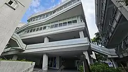 Library and Teaching Resources Building, abbreviate as the Library Building, was completed and opened on June 29, 2018. It was designed by architect Shengyan Chen (Chinese: 陳勝彥). Because the old library was renovated by classrooms, the book collection capacity has reached its limit, and the floor cannot bear the weight of the books, so it applied in 2010 The Ministry of Education's ''Emerging Construction Project Competitive Program'' subsidizes the construction of a new library building.[34] In 2015, the craft classroom and female staff dormitory were demolished to use as land for the new library building. When the construction started, there was controversy over the protection of underground archaeological site. The Tuzi Building has four floors, with a total building area of 958 square meters. The building adopts a high-ceiling design, with white beams and transparent glass walls as the main visual design. It has a sofa reading area, an electronic information retrieval area, and multiple group rooms. Discussion rooms, large multi-functional study rooms and other spaces can accommodate about 100,000 books.[35][36]