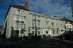 During the Georgian period, The Angel served as a coaching inn.[2] It dated to before 1736, as records indicate that a William Dunwoody passed it on to his son. The current building dates to later, mainly the early 19th century with a southeast wing probably of the late 18th century. An 1834 map reveals that there was once a carriageway through to the inn-yard at the central entrance, but by the early 20th century this had been altered, as shown in photographs of the period.[1] During the 1830s, the Sovereign Light Coach service ran carriages back and forth daily from the Angel Hotel to Hereford,[3] while the Mountaineer service ran from Merthyr Tydfil, through to Newport and the Angel Hotel, before going on to Worcester, Wolverhampton and Birmingham.[4]