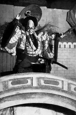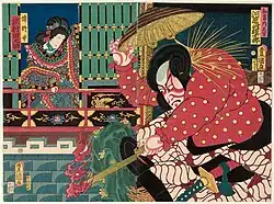 The Battles of Coxinga (国姓爺合戦, Kokusen'ya Kassen; Japanese pronunciation: [ko.kɯ̥.seɰ̃.ja kaꜜs.seɴ][1]) is a puppet play by Chikamatsu Monzaemon. It was his most popular play. First staged on November 26, 1715, in Osaka, it ran for the next 17 months, far longer than the usual few weeks or months. Its enduring popularity can largely be attributed to its effectiveness as entertainment. Its many scenes over more than seven years follow the adventures of Coxinga (based on the adventures of the historical figure Koxinga; as the play is loosely based on history, it is a jidaimono play, not a domestic play) in restoring the rightful dynasty of China. It features effects uniquely suited for the puppet theater, such as the villain Ri Tōten gouging out an eye (ostensibly to prove his loyalty). Donald Keene suggests that the adventures in exotic China played well in isolationist Tokugawa Japan. While generally not considered as great in literary quality as some of Chikamatsu's domestic tragedies like The Love Suicides at Amijima, it is generally agreed to be his best historical play.