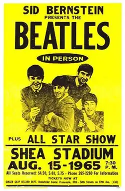 The opening show, at Shea Stadium in the New York City borough of Queens, on 15 August was record-breaking and one of the most famous concert events of its era.[9][10] It set records for attendance and revenue generation. Promoter Sid Bernstein said, "Over 55,000 people saw the Beatles at Shea Stadium. We took $304,000, the greatest gross ever in the history of show business."[11] It remained the highest concert attendance in the United States until 1973, when Led Zeppelin played to an audience of 56,000 in Tampa, Florida.[12] This demonstrated that outdoor concerts on a large scale could be successful and profitable. The Beatles received $160,000 for their performance, which equated to $100 for each second they were on stage.[13][14] For this concert, the Young Rascals, a New York band championed by Bernstein,[15] were added to the bill.[6]