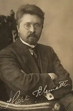 Sibelius, in a move intended to reclaim sole artistic ownership of The Bells of Kallio Church, arranged the piece for solo piano a few days after the consecration; on 13 September, he supplanted Klemetti's arrangement with his own for mixed choir a cappella.[2] Sibelius sold both arrangements in October to the Leipzig-based music publisher Breitkopf & Härtel. According to the musicologist Sakari Ylivuori, an authority on Sibelius's choral music, the autograph manuscript of the arrangement for mixed choir contains no text underlaid, apparently because Sibelius had disliked Engström's "mediocre" poem and had hoped that the Finnish poet Otto Manninen would contribute a new text. In the end, Sibelius settled—ironically—for a new lyrics penned by Klemetti, which Breitkopf received on 17 December.[2]
