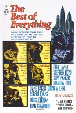 The Best of Everything is a 1959 American drama film directed by Jean Negulesco from a screenplay by Edith Sommer and Mann Rubin, based on the 1958 novel of the same name by Rona Jaffe.[2] It stars Hope Lange, Stephen Boyd, Suzy Parker, Martha Hyer, Diane Baker, Brian Aherne, Robert Evans, Louis Jourdan, and Joan Crawford. The film follows the professional careers and private lives of three women who share a small apartment in New York City and work together at a paperback publishing firm. Alfred Newman wrote the musical score, the last under his longtime contract as 20th Century-Fox's musical director.