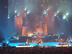 My Chemical Romance released their third studio album, The Black Parade, on October 23, 2006, through Reprise Records.[1] A concept album, it centers around a man dying from cancer, known as "the Patient", who reflects upon his life as he nears his death,[2] which is presented to him in the form of his fondest childhood memory: seeing a marching band.[3] This also led to the creation of an alter-ego band named after the album, simply titled the "Black Parade".[4] The album was supported by The Black Parade World Tour,[5] where the band would play the album in its entirety as the Black Parade.[6] They played as the Black Parade alter-ego until October 24, 2007, when the alter-ego was killed off at their performance at the Palacio de los Deportes in Mexico City.[7] Their performances as the Black Parade were noted for their "theatrical"-styled production,[8] featuring elaborate stage designs and elements like pyrotechnics that would go off during certain songs.[9][10]