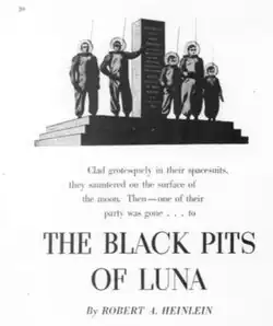 "The Black Pits of Luna" is a science fiction short story by American writer Robert A. Heinlein, about a Boy Scout on a trip to the Moon and his novel way of finding his lost brother. Included as part of his Future History, it originally appeared in The Saturday Evening Post, January 10, 1948, and was collected in The Green Hills of Earth (and subsequently The Past Through Tomorrow).