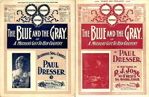 1. ^ Dresser, Paul (1900). "The Blue and the Gray, or A Mother's Gift to Her Country": Descriptive Song & Chorus. New York City, NY, US: Hawley, Haviland & Co. Retrieved February 16, 2013.