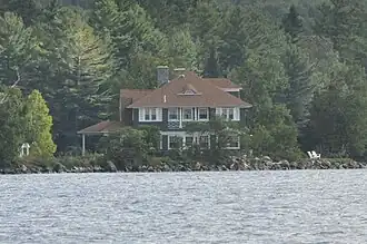 The Breakwater is a two-story wood-frame structure, set at the southern end of the narrow peninsula projecting south from Mount Kineo into Moosehead Lake, Maine's largest lake. The main block is set on stone piers and topped by a shingled hip roof, with a side ell of 1+1⁄2 stories that is gambrel-roofed. The primary facade faces the lake to the south, with a two-story recessed porch at its center, and flanking multiwindow bays on either side. A beltcourse of trim separates the first and second floors, rising in gentle keystoned arches above the windows of the side bays. A hip-roof dormer pierces the roof above the porches. The western facade is somewhat similar in appearance; the first-floor porch has been glassed in, and there is an eyebrow dormer above the porches. Windows on the first floor are twelve-over-one on the first floor and six-over-one on the second. The porch balustrades are diamond-shaped woodwork.[2]