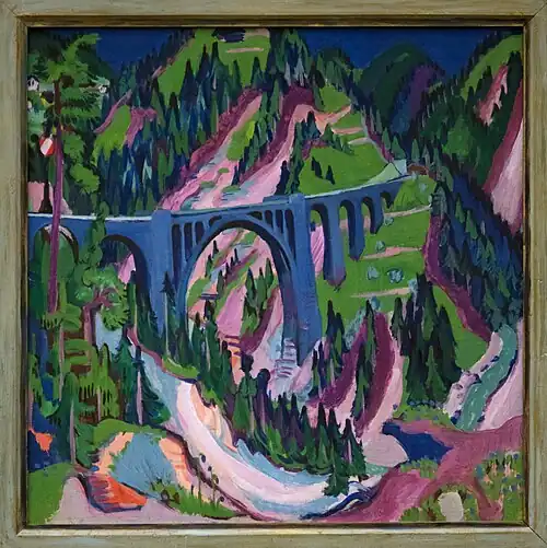 The center of the painting depicts the railway viaduct of the Rhaetian Railway over the Landwasser river near Davos-Wiesen, a well-known structure of Alpine railway architecture. The structure had been completed in 1909, so it was still quite new when the painting was made. Kirchner depicts a view of the viaduct as seen from the south. Compared to Kirchner's earlier depictions of buildings and structures, which often showed distorted proportions and perspectives, this image is closer to reality. In his depiction, Kirchner pays attention to the lines of the bridge and precisely reproduces the parabolic construction of the main arch and the semicircular formation of the smaller arches. The colors of the picture do not correspond to reality, but to Kirchner's artistic conception.[4]