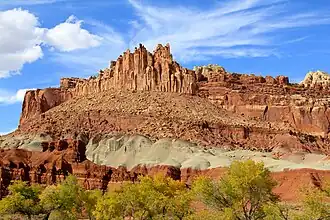 The Castle is a 6,387-foot (1,947 m) summit in Capitol Reef National Park in Wayne County, Utah, United States.[2] This iconic landmark is situated 0.5 mi (0.80 km) immediately north of the park's visitor center, towering nearly 800 feet (240 m) above the center and Utah State Route 24. Precipitation runoff from this feature is drained by tributaries of the Fremont River.