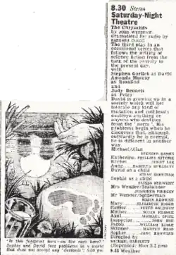 The Chrysalids is an adaptation of the John Wyndham 1955 novel of the same name, produced as a radio play by the BBC in March 1981. It was first broadcast on BBC Radio 4 on 25 April 1981 with an audience of 150,000 listeners. The play was edited into three half hour episodes and broadcast in Canada by CBC Radio from 10–24 June 1983.