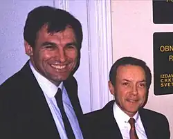 The first sacrament meeting was held in Zadar on September 11, 1972.[5] The Zadar Branch, Croatia's first, was organized in 1974.[1][6] A limited number of North American missionaries served in Yugoslavia on limited assignments in the late 1970s. In 1981, the first full-time missionary called from Yugoslavia, Radmila Ranović, started her mission. She was called to serve in the Canada Montréal Mission. In 1982, the Zagreb Branch was organized. President Thomas S. Monson dedicated Croatia for missionary work on October 31, 1985, in Zagreb. Through much of the 1980s, missionaries were only permitted to speak about the Church if they were first asked by a potential investigator. In April 1987, Russell M. Nelson and other church leaders met with government authorities and received verbal permission for missionaries to openly proselytize in Croatia. The LDS Church received official government recognition in September 1987.[7] Seminary began in 1997. On May 25, 2008, a major public square in Zagreb was named after Krešimir Ćosić. Institute began in 2008.