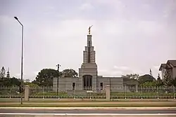In 1993, church president Gordon B. Hinckley visited Ghana for the first time and announced a new temple. He visited again in 1998 to find the property upon which the temple would be built.[7] In preparation, the temple ordinances were translated and recorded into the Twi and Fante languages. Construction began with a groundbreaking ceremony held on November 16, 2001, with Russell M. Nelson presiding. The vice-president of the Republic of Ghana, Aliu Mahama, was also present. Nelson also met with the President of the Republic of Ghana, John Kufuor during his visit.[7] The Accra Ghana Temple was dedicated in 2004. It is Ghana's only temple and became the church's 117th working temple.[16] As of 2019, there are four operating missions in Ghana: Accra, Accra West, Cape Coast, and Kumasi.[23]