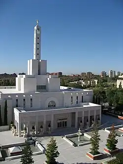 The Madrid Temple was dedicated in 1999. The temple complex includes the Madrid Spain Temple, the Spain Missionary Training Center, an institute, temple patron housing, a distribution center, a Family History Center, and underground parking.