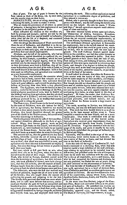 The lemma on "Agriculture" gave an account on the origin and historical development of agriculture and agricultural writings. The origin of this art and science is synchronized with the Bible, and reads: