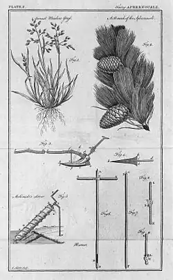 We have also here accounts of the advantages of cultivating Bore-cole, Cabbages, Carrots, Parsnips, etc. for feeding cattle together with the best methods of cultivation. The new species of grass in that time introduced are here described, and the best methods of cultivating them fully explained; such as Bird-grass, Black-grass, Timothy-grass, etc. Under the articles Farm, Common, Hay, Inclosing, Mowing, Ploughing, Seed, Sowing, Threshing, etc. the reader will find very useful instructions and observations, many of which are perhaps no where else to be found. Besides the common machines used in the practice of husbandry, we have here ample descriptions and accurate drawings of Mr. Hewitt's new Horse-hoe, Mr. Comber's Cutting-box, Mr. Clarke's Draining-plough, Mr. Ogden's Fallow-cleansing Machine, Mr. Randall's Spiky Roller, etc. etc. Under the article Bee, the authors have given a very full account of that laborious and useful insect, together with all the improvements that have been made with regard to the management of Bees, and the methods of taking the wax and honey without destroying them, according to the practice off White; Thorley, and Wildman.[3]
