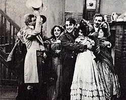 Opening in the home of Caleb Plummer, an old toymaker, we see his son, Edward, departing for the sea. A tender farewell to father and blind sister, Bertha, takes him to the road where he bids adieu to his sweetheart, Mary Fielding. There is then a lapse of three years and we find honest John Pereyhingle the husband of Dot. Mrs. Fielding has gotten into moderate straits and consents to the marriage of Old Tackleton, the grouch, to May. This is repugnant to May, whose heart is set on Edward. Edward returns, stopping on the way at the King George Inn where he learns of the approaching nuptials of Tackleton and May. Borrowing a disguise from a strolling Merry Andrew, he goes in the garb of an old wayfarer on John’s cart to see Dot and find out the truth. John, prompted by Tackleton, watches the pair. Not recognising Edward, John assumes he is a lover. Edward upon learning from Dot how inimical the match is to May resolves to carry her away, which he does with the assistance of Dot. They are married in the roadway just as the much perturbed Tackleton appears. John discovers what a fool he has been in doubting Dot, Tackleton realises what an unpopular grouch he has been and decides to change, while Bertha and Old Caleb are overjoyed at the return of Edward.[3]