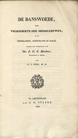 - ^ a b c d e f g h Hecker, Justus Friedrich Karl (1833). Die Tanzwuth, eine Volkskrankheit im Mittelalter [De danswoede, eene volksziekte der middeleeuwen, in de Nederlanden, Duitschland en Italië] (in Dutch). Translated by Pool, G. J. Amsterdam: C. G. Sülpke.