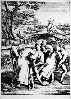 The dancing plague is an epidemic that occurred multiple times between the 14th and 17th century in different European regions.[2] Key sources from 1518 used by Hecker in The Dancing Mania identify the diagnosis of 'hot blood' given to the afflicted, as well as the common belief at the time that the plague was caused by demonic possession.[5][6] For example, in one source from the early 16th century, Paracelsus' misogynistic views led to a theory that the dancing plague was caused by women, with three different subtypes of the illness caused by either imagination, sensual desires, and corporeal causes (such as mental illnesses in unhappy wives).[5][7] Previous medical theories considered the dancing plague to be a form of physical illness. For example, Thomas Sydenham explored chorea in the 17th century, in which his description of symptoms of what he named chorea minor (also known as Sydenham's chorea) were very similar to what was observed in those afflicted with the dancing plague.[8] Sydenham's chorea was often incorrectly referred to as St. Vitus' dance.[8][9]